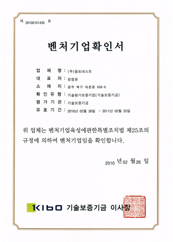 인증 | 벤처기업확인서 페이지 정보 작성자 관리자 작성일10-10-15 09:20 조회17,026회 댓글0건 관련링크 이전글 다음글 목록 본문 벤처기업확인서 댓글목록 등록된 댓글이 없습니다. 이전글 다음글 목록