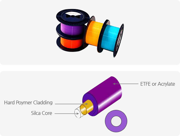 The hard polymer cladding provides higher tensile strength and greater resistance to moisture than the conventional one. These features together create a fiber widely used in fields of telecommunication and industry, and near-IR spectroscopy. Large core with 200μm~600μm diameter provides an excellent coupling efficiency for data links and connectors.